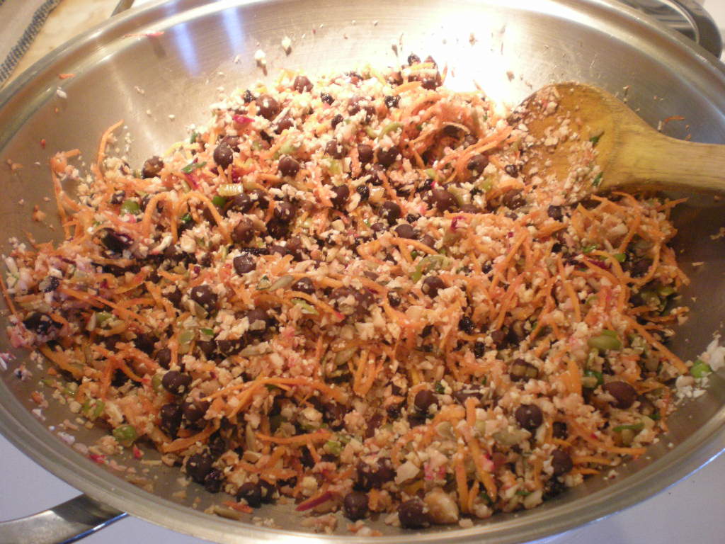 - Add the cauliflower ”couscous”, the grated carrot, the currants, the olives and the baharat. Toss well to distribute the spice mixture evenly throughout the dish.