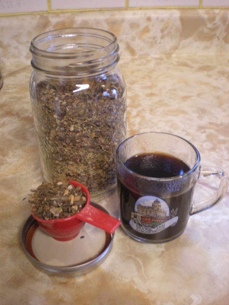 Combine all the ingredients and store in a glass jar. For every four cups of water, add a heaping quarter cup of the mixture. Bring water and herbs to a simmer and decoct 10-20 minutes until the brew is dark, thick and fragrant. Strain and serve hot, with milk and sweetener if desired.