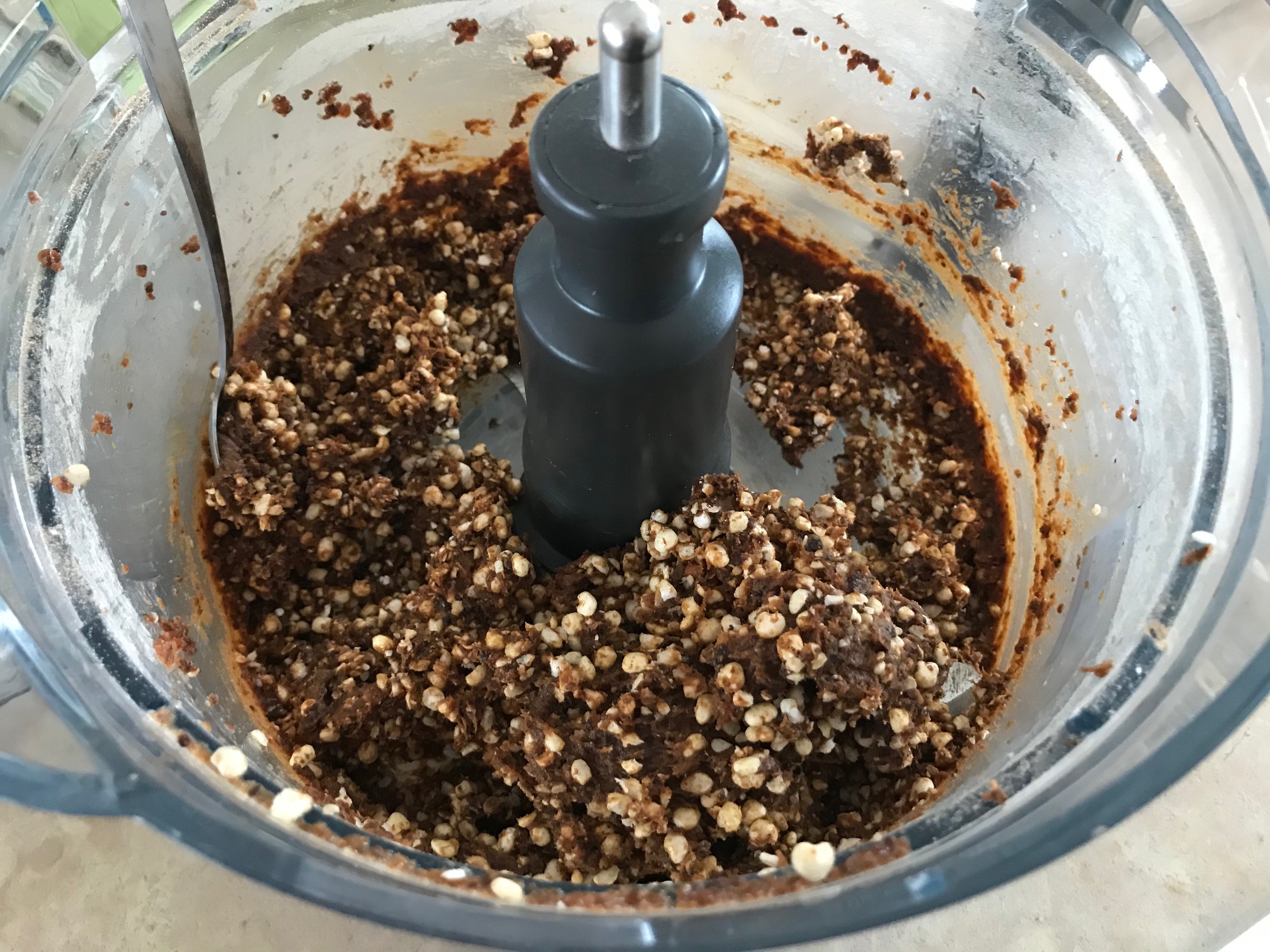 - Add the puffed millet (or quinoa) and pulse to combine. Some of it can break apart a bit, that’s fine, but try and keep most of the cereal whole.