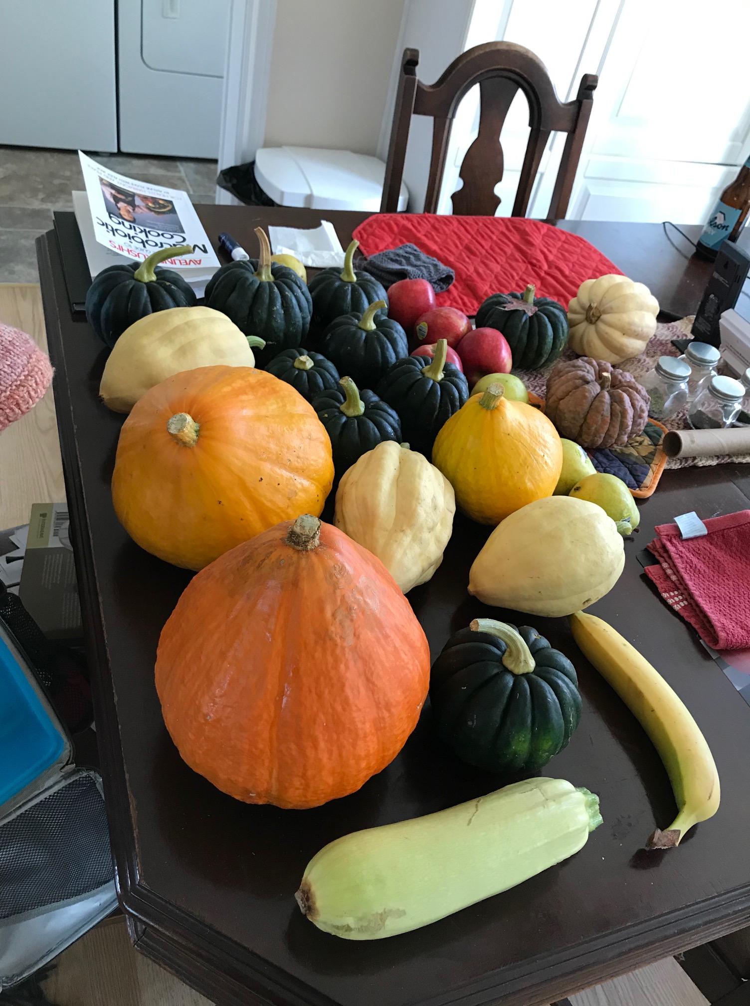 Currently, as a result of harvest in the garden, there is squash stashed in every nook and crany of the house. My partner had to put up extra shelving to house the winter squash since until they did, the kitchen table looked like this: