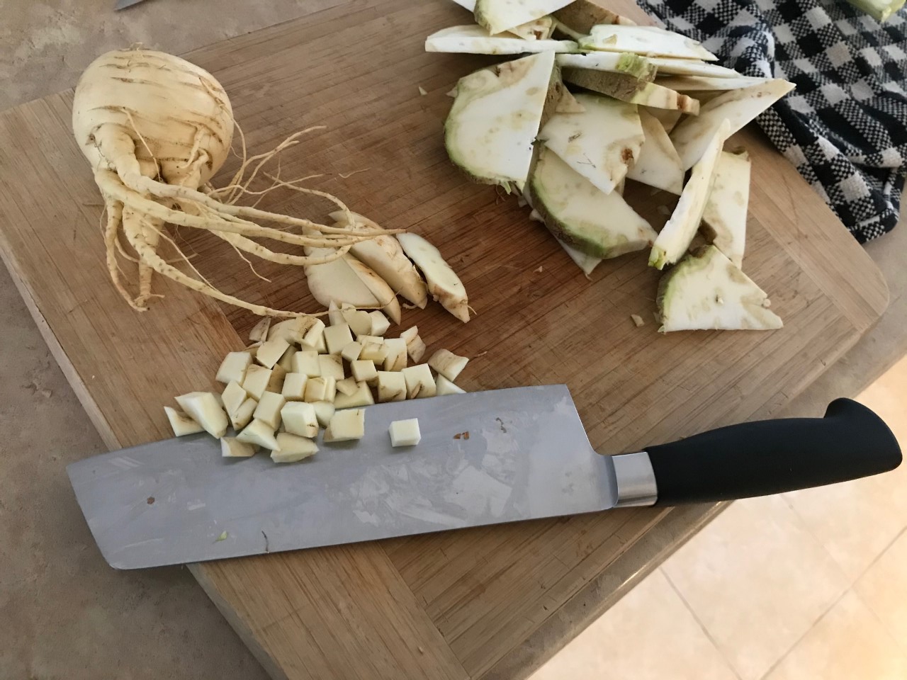 - 1-1/2 cups small diced parsnip (same note as for the celeriac concerning the whole peeling thing