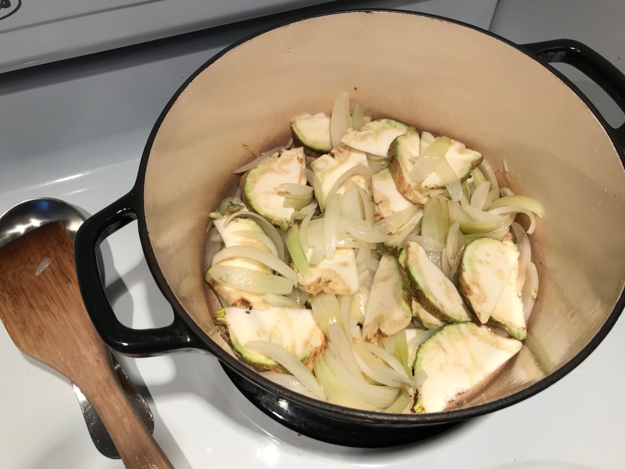 - Heat a Dutch oven or heavy bottomed pot over medium heat. When hot, add the oil and sliced onions and turn the heat to medium low. Cook the onions, stirring now and again, until soft and translucent. Lower the heat as necessary to prevent browning.