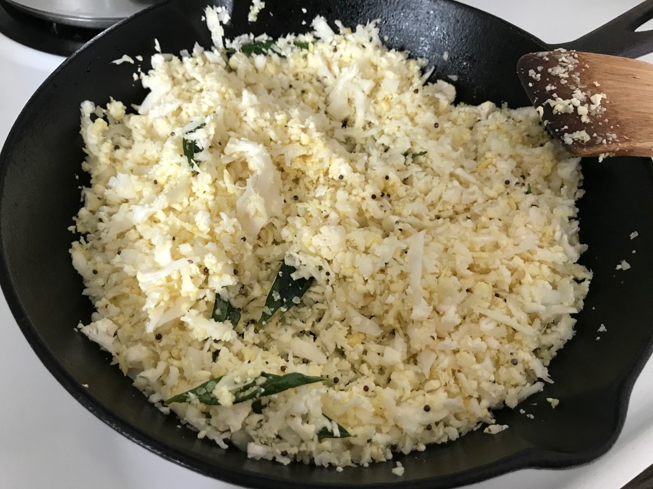 - Stir once and add the riced cauliflower to the pan. Stir to coat in oil and cook, stirring now and again for 3 or 4 minutes.