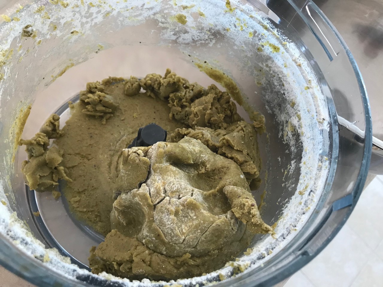- Add the flour, a third (or so) at a time (no need to be too precise); until the full amount has been added. At the last addition, run until a ball forms. A bit of flour left is fine, you’ll be able to work it in by hand.