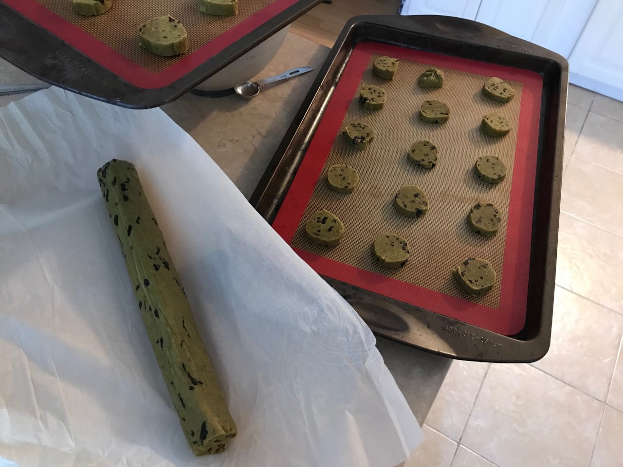 - When ready to bake, preheat the oven to 300F. Line two baking pans with parchment or silicone liners. Unwrap one of the two logs, leaving the other in the fridge until ready to bake it. Cut the log into 1/3” thick slices and set the slices onto the cookie sheets, leaving an inch or two between cookies.