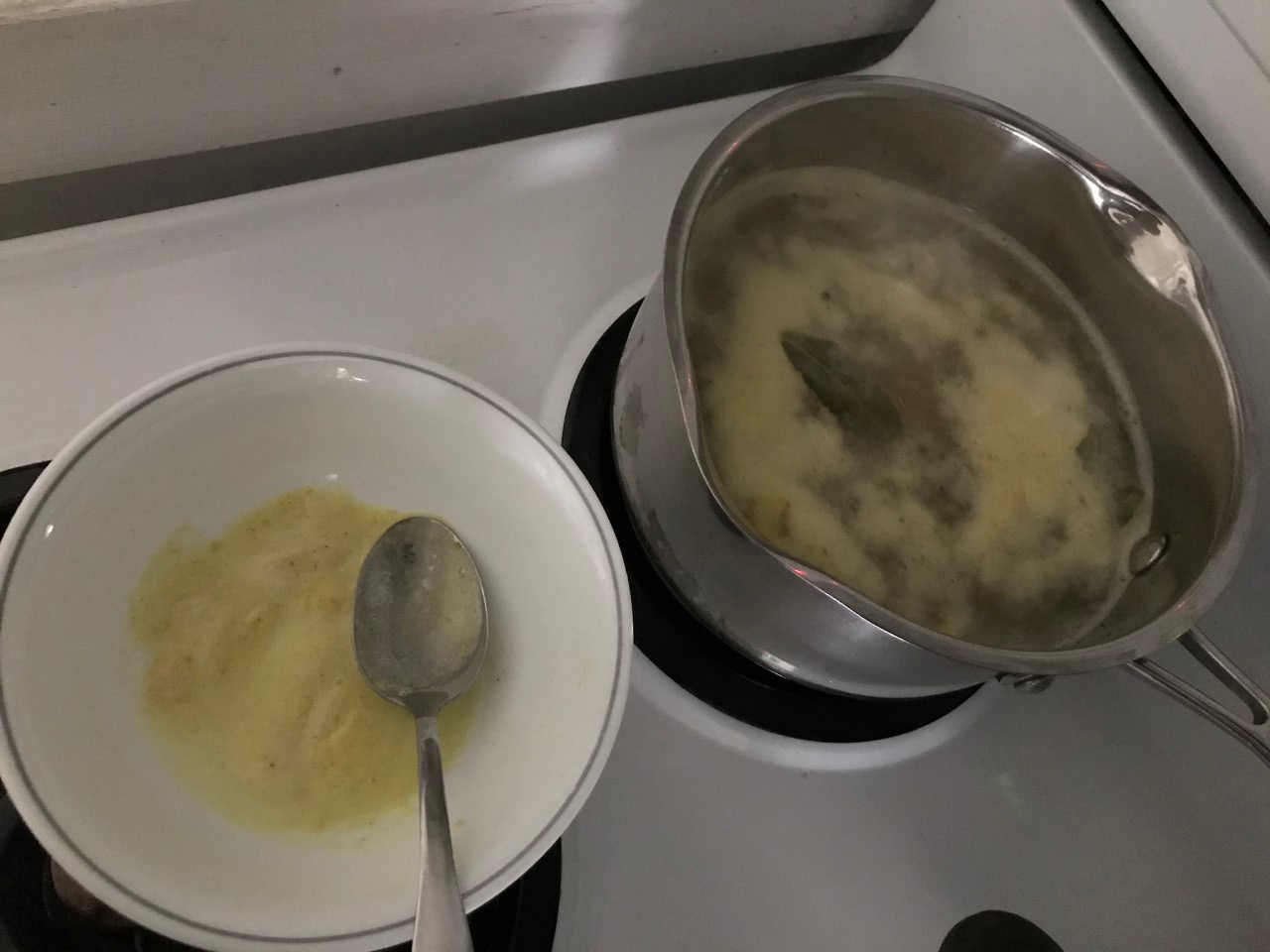 - Place the chana dal in a 2 or 3 quart pot with 4 cups of fresh water. Add the bay leaves, ginger slices and whole cloves. Bring to a boil. Hard boil for 5 minutes, skimming off the foam and scum that rises.