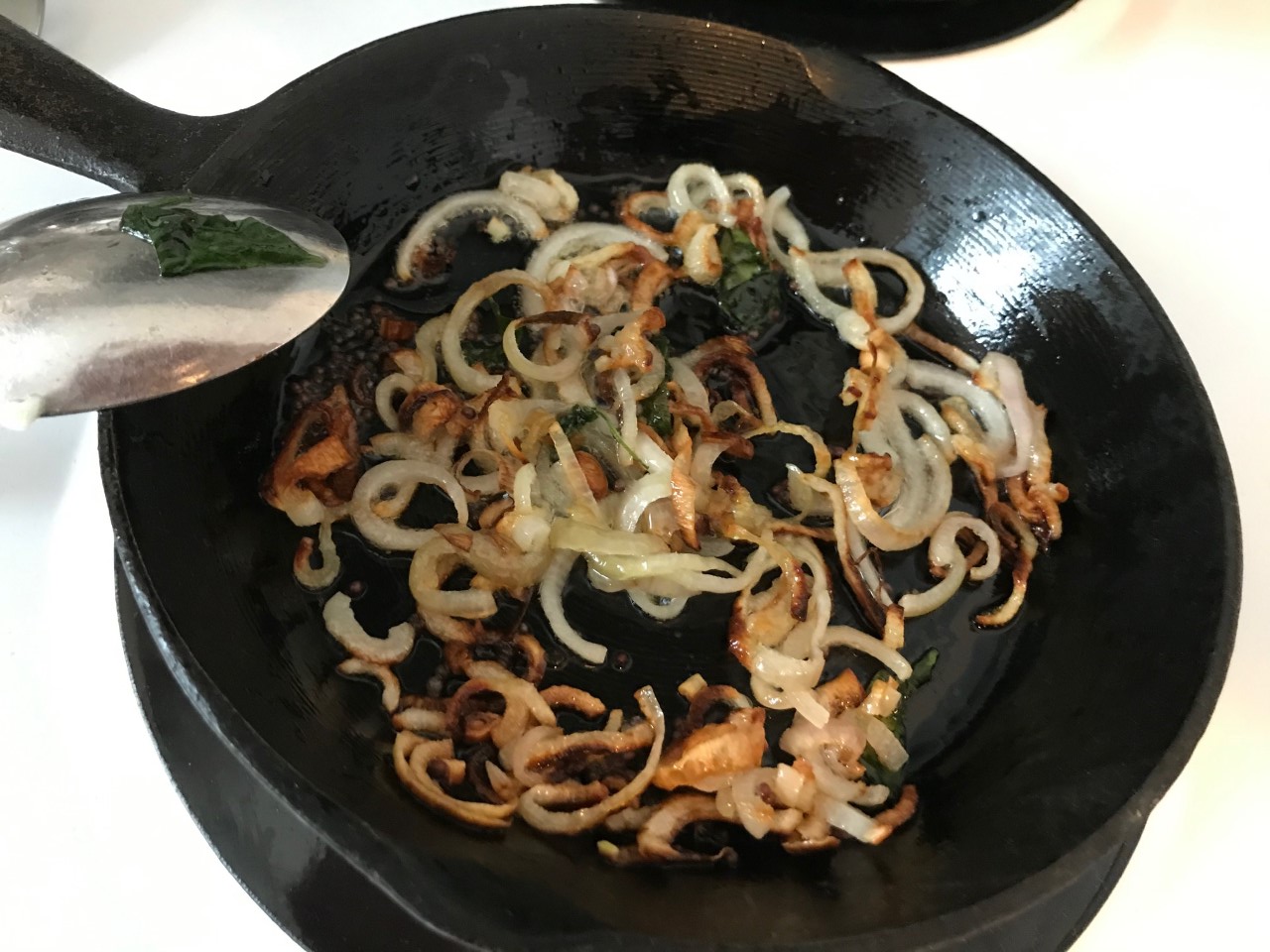 - While the dal is doing its final simmer, heat a small fry-pan over medium heat. When hot, add the sesame oil, mustard seeds, sliced shallot and curry leaves. Stir and fry 10-15 minutes, until the onion is reddish and crispy (but NOT burnt).