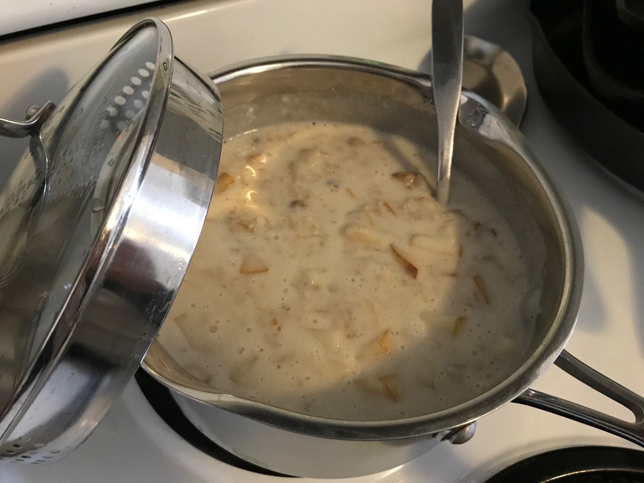 - In a saucepan or cooking pot that you have a cover for, combine the almond milk (no need to strain), pears and raisins.