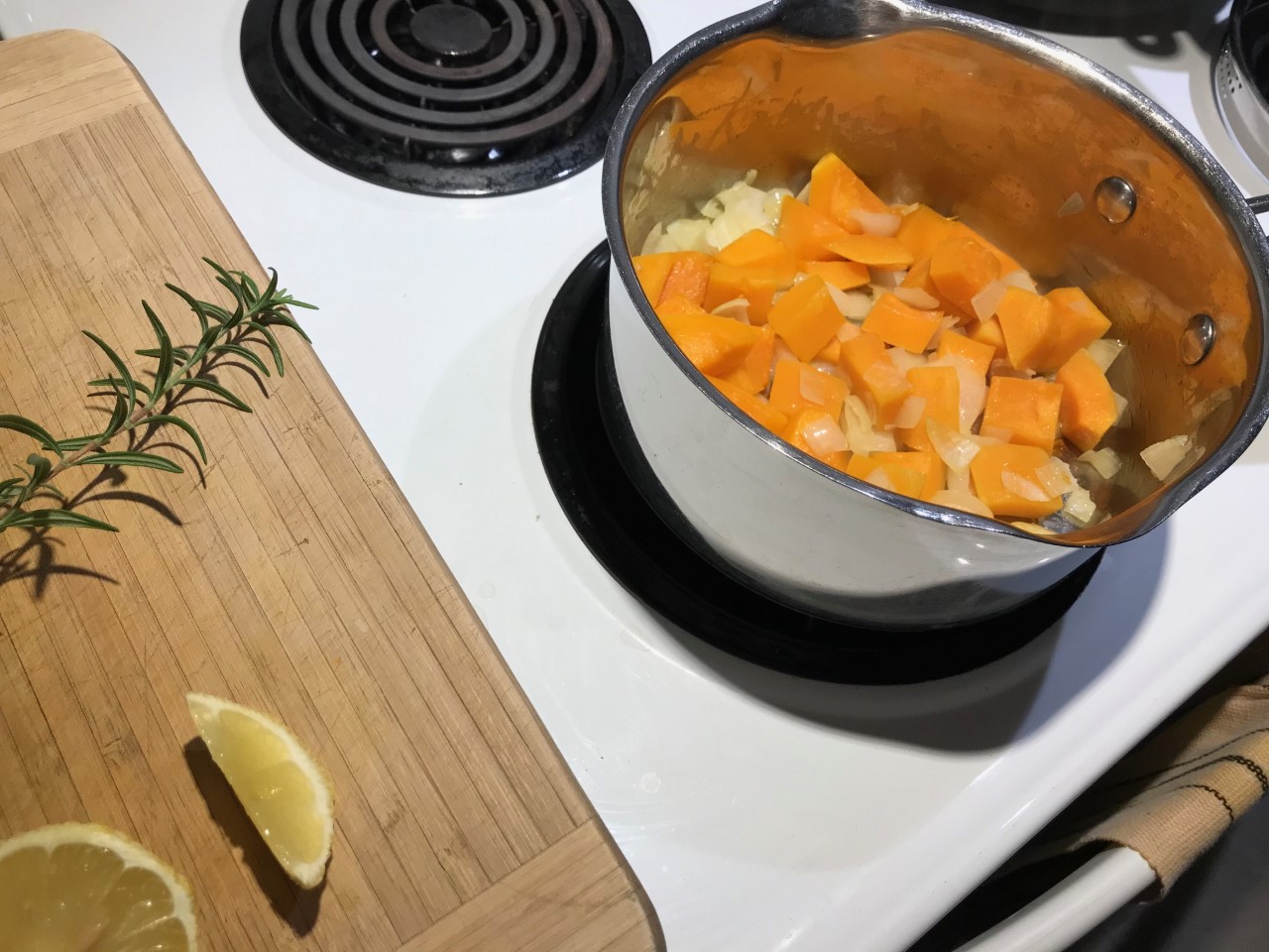 - Sauté the vegetables over medium-low until they’re bright, soft and there are starting to be beautiful caramel bits on the bottom of the pot – 15 to 20 minutes at least. Turn the heat down as required if things are moving to fast. Could you do this step more quickly? Sure. But the longer you take cajoling flavour out of those beautiful roots and fruits, the better your soup will taste. So take your time. Make some tea. Put on some music. Knit. Watch the rain. And let the stovetop do the cooking.