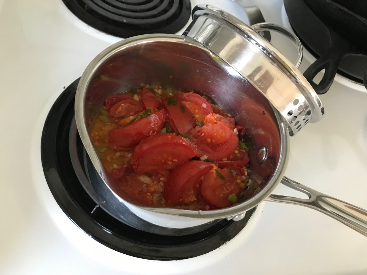 - Place the chopped tomato, scallion and lemongrass in a small saucepan with a sprinkle of salt. Heat over medium flame until bubbling and then simmer on medium-low, covered, until the tomato loses its raw colour and becomes highly fragrant – about 8 minutes.